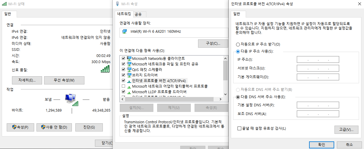 "인터넷 프로토콜 버전 4(TCP/IPv4) 속성" 에 들어갈 일이 없겠지만