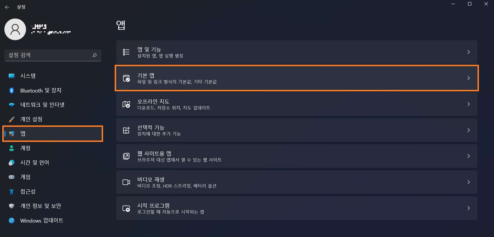 설정(단축키: Win + i) → 앱 → 기본 앱