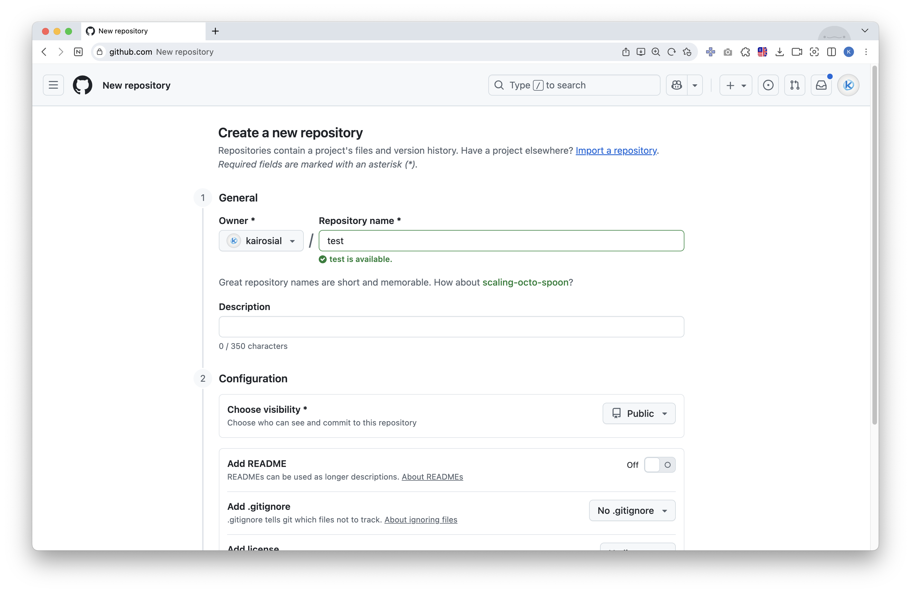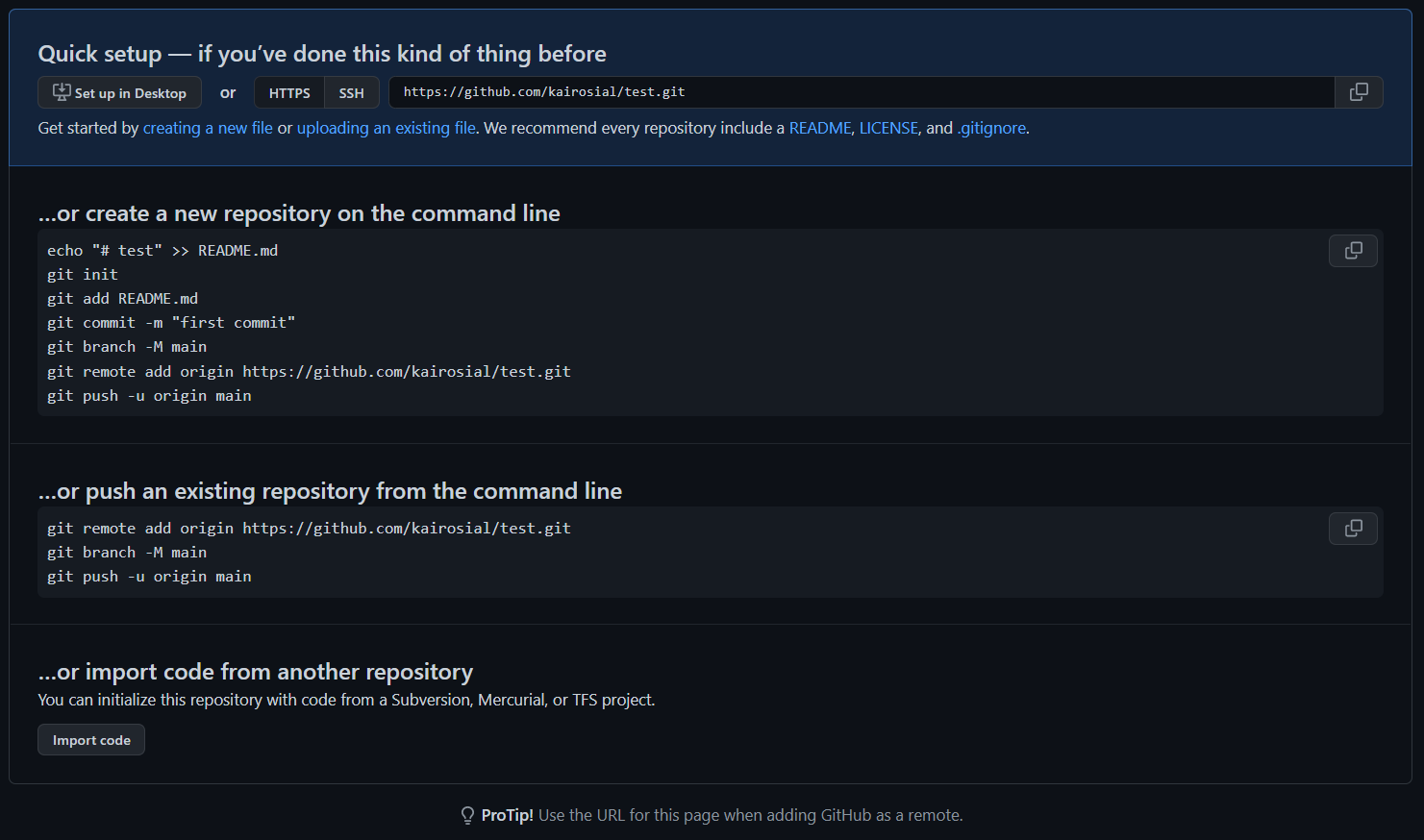 `remote repo`의 주소(https://github.com/kairosial/test.git)를 복사하고 터미널에서 아래와 같이 실행시켜주면 된다.