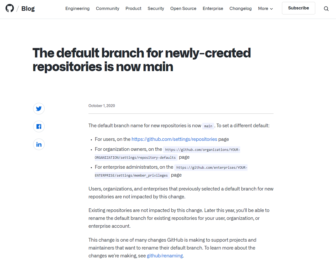 2020년 10월 1일을 기준으로 GitHub에서 새롭게 생성되는 repository의 branch 기본값이 master에서 main으로 변경되었다.그리하여 Git branch의 기본값은 master이고, Github의 branch 기본값은 main이다. `git branch -M main`는 branch 기본값을 main으로 사용하겠다는 뜻이다.