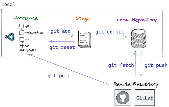 원격에서 로컬(내 컴퓨터)로 소스코드를 받아온 뒤 변경사항이 생기면, 그 변경사항을 원격에 다시 업데이트하는 흐름이다.