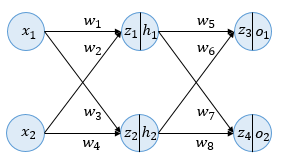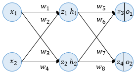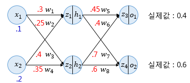 예제, 2개의 입력, 2개의 은닉층 뉴런, 2개의 출력층 뉴런, 은닉층과 출력층의 활성화함수는 시그모이드 함수