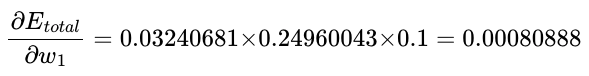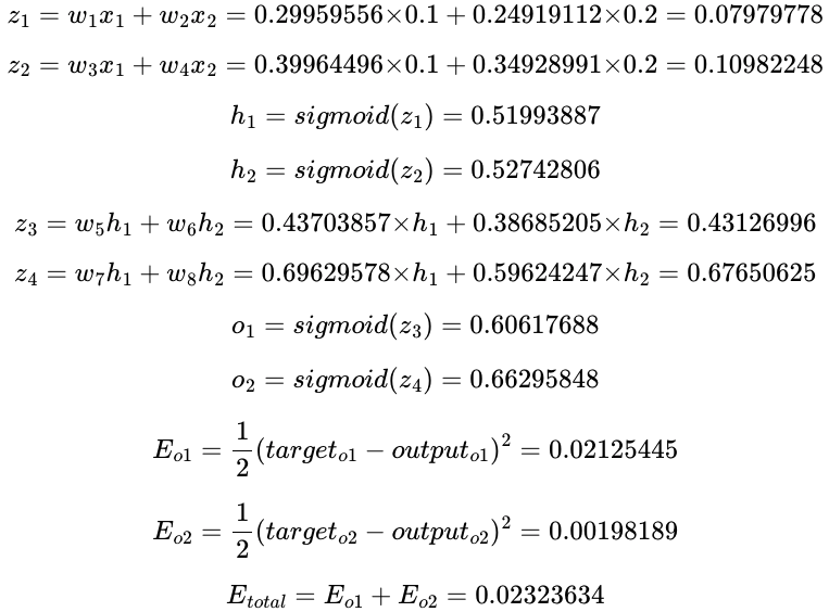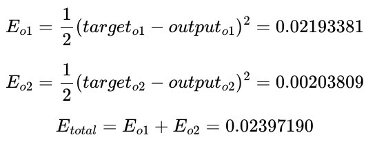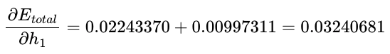 기존의 전체 오차 $E_{total}$이 $0.02397190$였으므로, 역전파를 통해 오차가 감소한 것을 확인할 수 있음