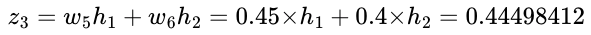 은닉층과 출력층의 $z$ : 이전층의 모든 입력이 각각의 가중치와 곱해진 값들이 모두 더해진 가중합;