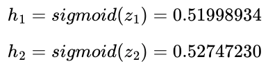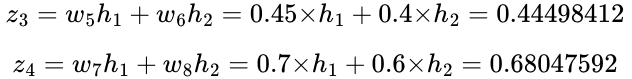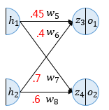 다시 입력값($h_{1,2}$)과 가중치($w_{5,6,7,8}$)를 곱