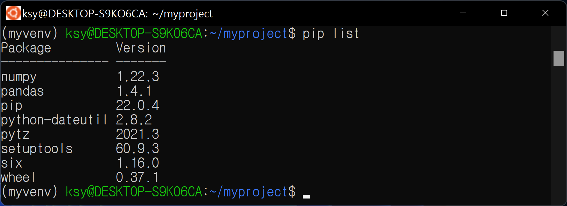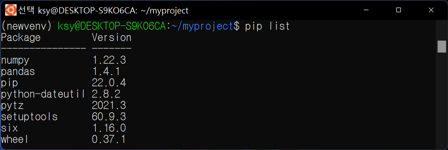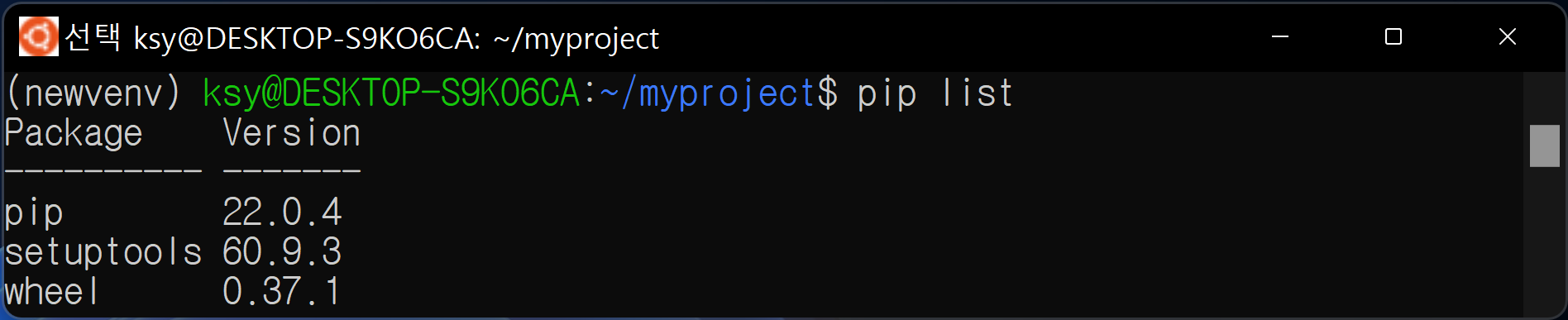 myvenv가 아닌 newvenv라는 새로운 가상환경을 만들고 활성화한 뒤 패키지 리스트를 확인해보면