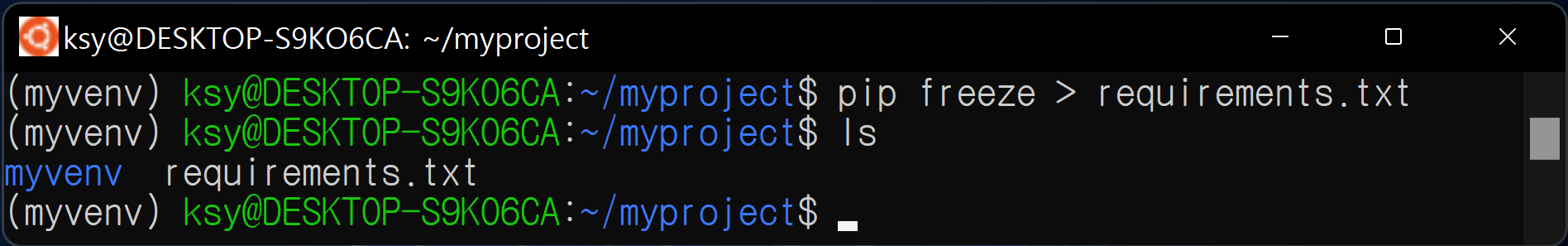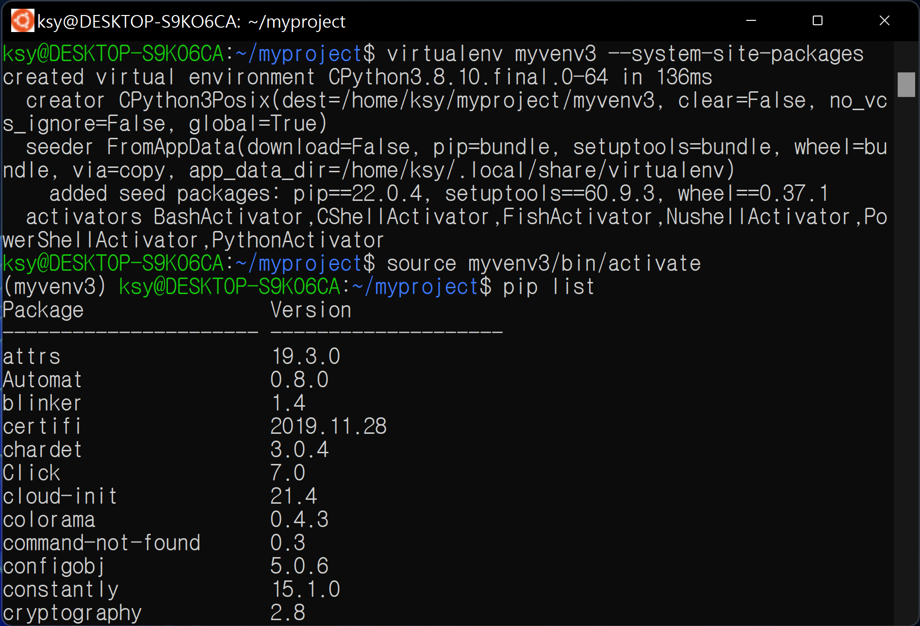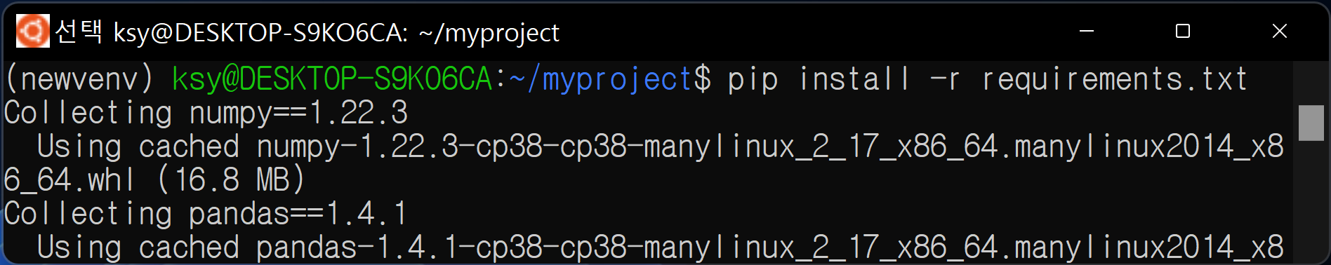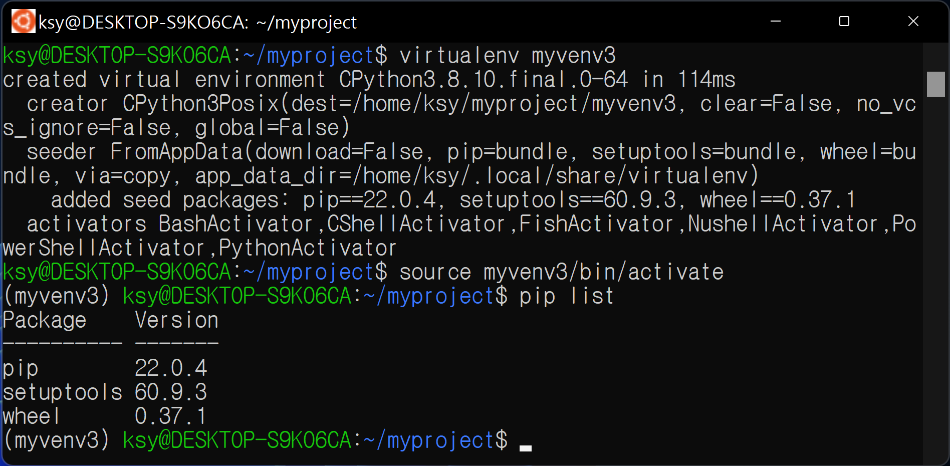 myvenv가 아닌 newvenv라는 새로운 가상환경을 만들고 활성화한 뒤 패키지 리스트를 확인해보면