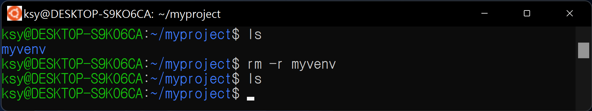 리눅스의 삭제 명령어인 rm 에 디렉토리 삭제 옵션인 -r 를 이용하여 가상환경 폴더를 삭제