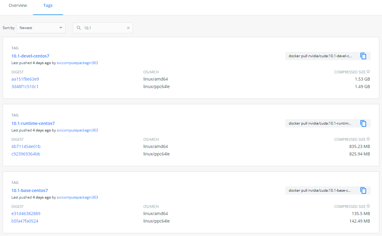 Tags 탭에서 원하는 CUDA 버전을 검색(ex. 10.1)하고